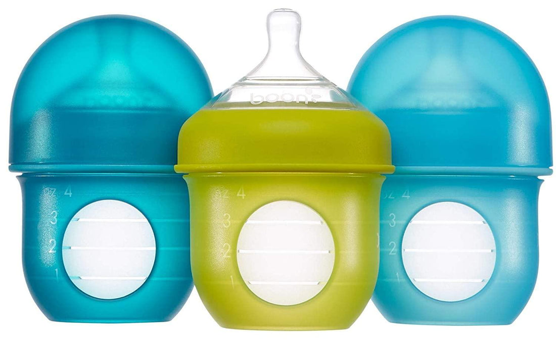 Boon, NURSH Reusable Silicone Pouch Bottle, Air-Free Feeding, 4 Ounce with Stage 1 Slow Flow Nipple (Pack of 3)